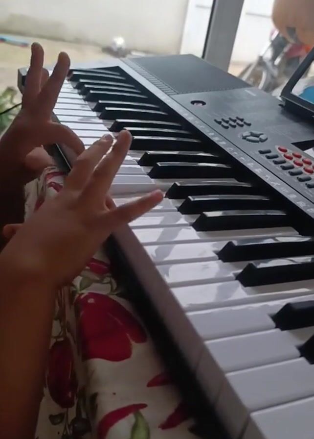 close-up of a person's hands playing an electronic keyboard. The keyboard is black and white, and the hands are positioned on the keys. The background includes a window with a motorcycle visible outside and a patterned tablecloth with red shapes resembling peppers. The fingers move across the keys to play a musical piece.