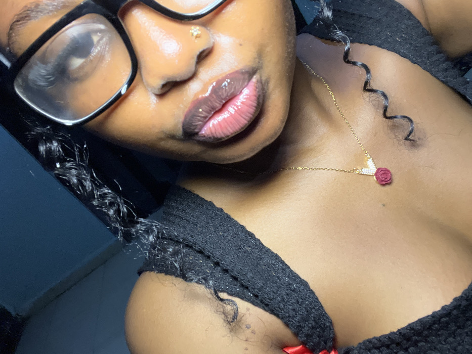 A close-up shot features a woman with glossy dark lips and a nose piercing. She wears black-framed glasses and a delicate gold necklace with a red rose pendant. Her dark, curly hair frames her face. She wears a black crocheted top with a hint of red lace peeking out. The lighting is soft, accentuating the shine on her skin.