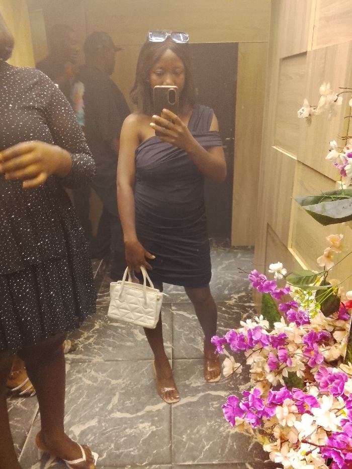 A woman in a one-shoulder black dress and clear heels holds a white quilted purse while taking a mirror selfie. Sunglasses rest on her head. Other people appear in the mirror's reflection, including a person in a dotted dress to the left. Flowers are visible on the right side of the image. The floor and walls are tiled.