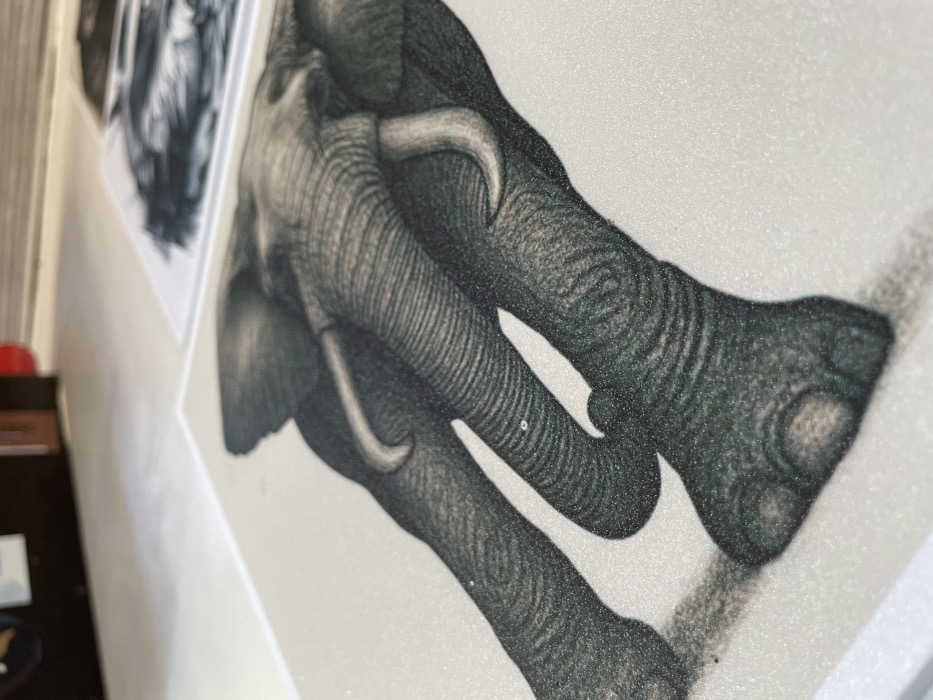 A close-up, angled view reveals a detailed monochromatic print of an elephant on a light-colored, granular surface