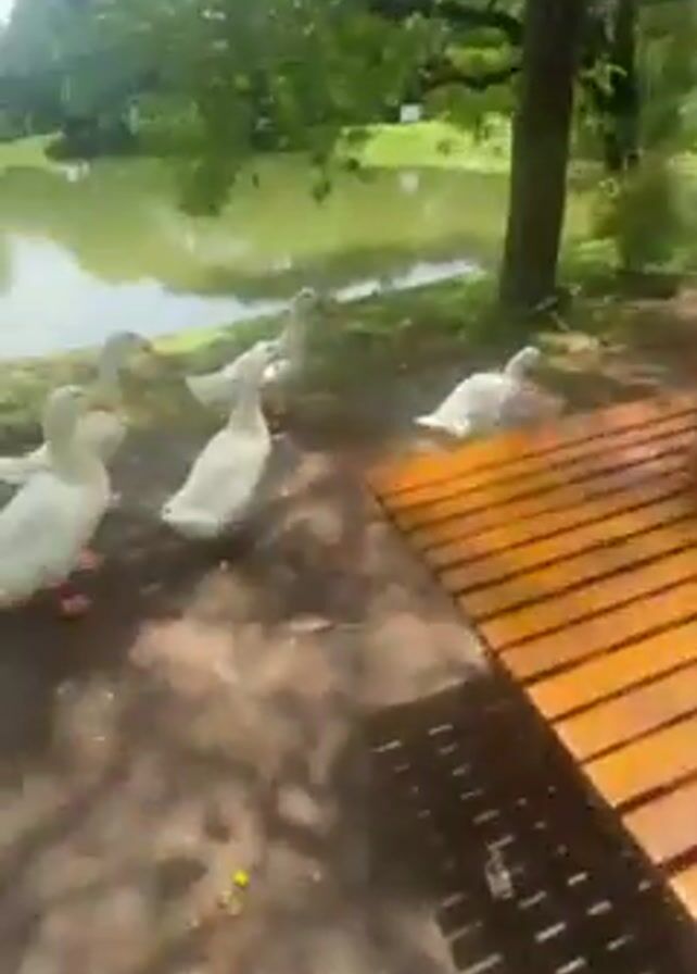 person sitting outdoors in what appears to be a park, with a pond visible. A flock of white ducks approaches, moving around tables and chairs where people are sitting. The ducks appear to be moving freely among the people, who seem unbothered by their presence. The setting is sunny and shaded by trees.