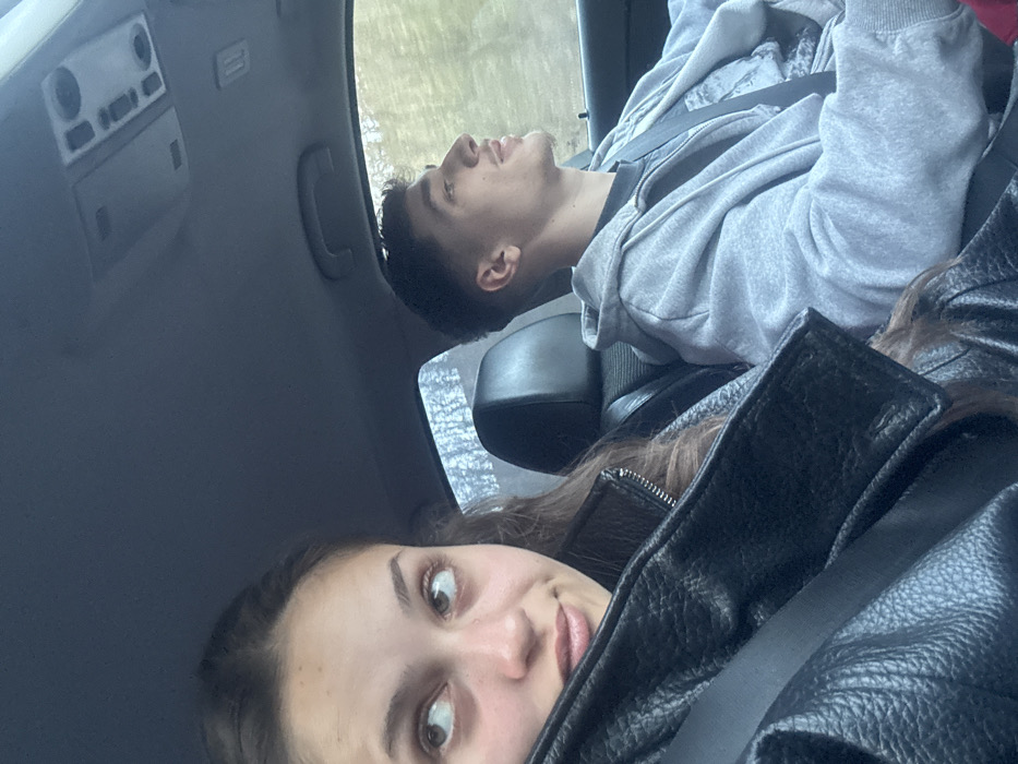 The image depicts the interior of a vehicle during daylight in Gorna Vasilitsa, Bulgaria. Two young adult individuals are seated in the front seats. A female occupies the front passenger seat, positioned in the foreground and to the left. She has long brown hair and is wearing a black textured leather-like jacket with a visible seatbelt crossing her chest. Her eyes are directed upwards and to her right, away from the camera, and her lips show a subtle smirk. A male occupies the driver's seat, positioned in the background and to the right. He has short dark hair with a faded haircut and light facial hair. He is wearing a light grey zippered hooded sweatshirt over a dark t-shirt, also with a visible seatbelt. His head is turned slightly to the right, and his gaze is directed forward and out of the vehicle. The car interior features dark trim, a dark headliner, an overhead console, and a grab handle above the passenger window. Through the windows, a blurred outdoor environment is visible, consistent with trees or vegetation alongside a road.