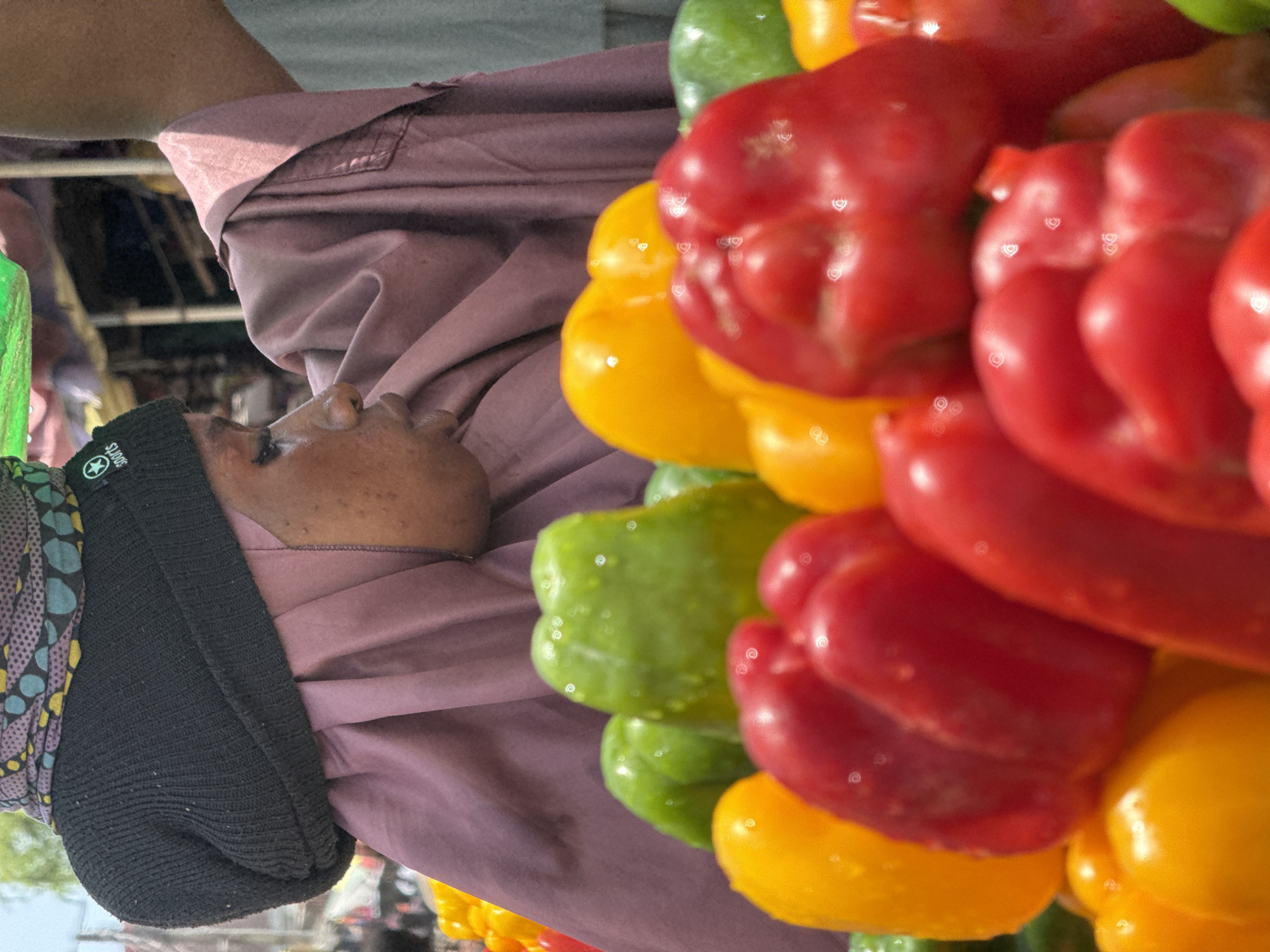 man in Ado, Nigeria, selling a bundle of colorful bell peppers. The peppers are red, yellow, and green. He is wearing a black hat and a maroon shirt. The image is taken at a low angle.