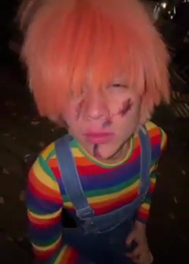 A person in a Chucky costume looks into the camera, tilting their head