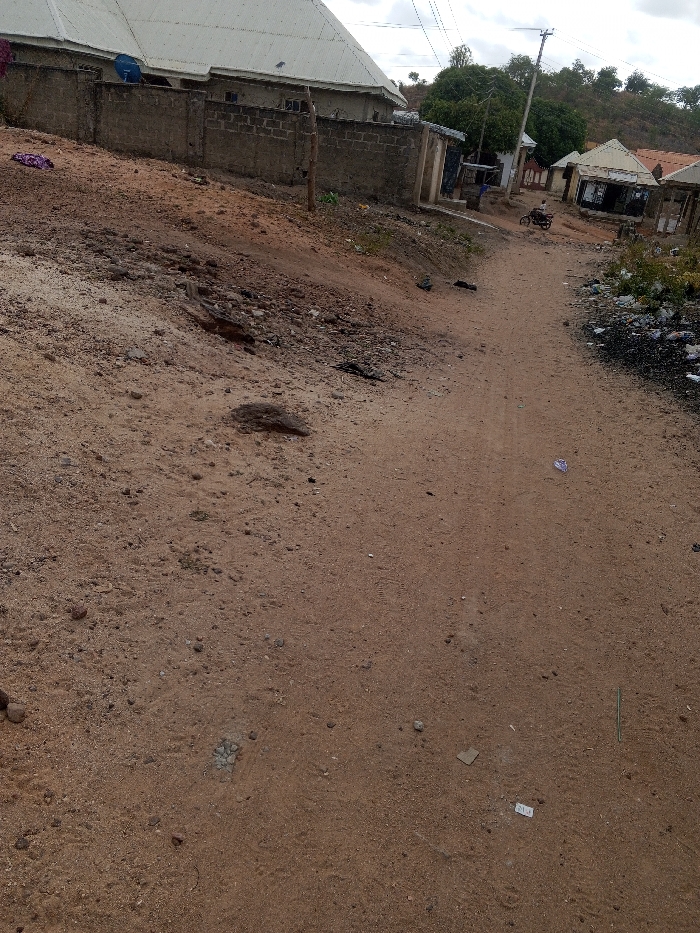 This image depicts an unpaved, reddish-brown dirt road in Lokoja, Nigeria, under an overcast sky