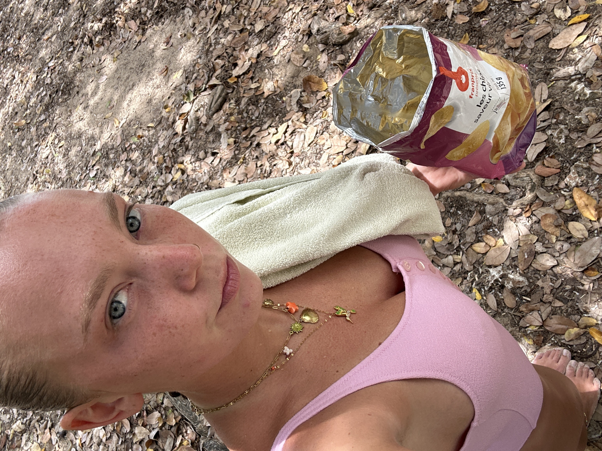 A selfie captures a female in Le Gosier, France, situated outdoors on ground covered with dry leaves, dirt, and visible roots. The subject, facing forward, has fair skin with freckles, blue eyes, and light hair pulled back. She wears a pink ribbed sleeveless top or swimsuit with three buttons and multiple layered gold necklaces featuring charms including a shell, a green bird, and colorful beads. A light green or cream towel is draped over her left shoulder and arm. She holds an open, partially consumed 135g bag of "Franprix les chips saveur" potato chips in her right hand. Her left foot, appearing to be covered in sand, is visible at the bottom left of the frame.