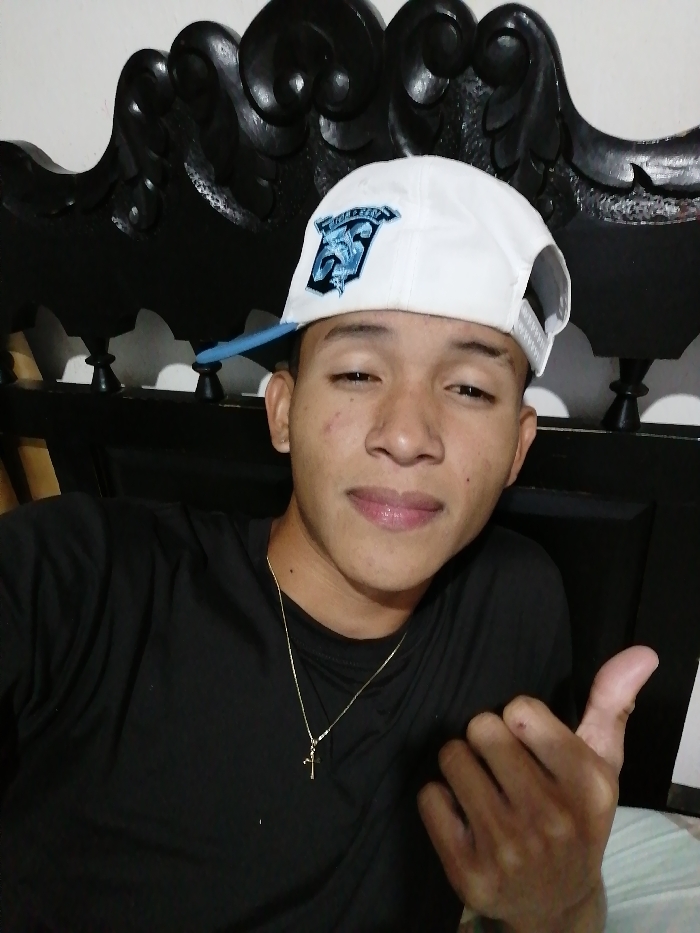 A young man is pictured in a selfie. He is wearing a black shirt and a white baseball cap with a blue logo. He also has a thin gold necklace with a cross pendant. He is giving a thumbs-up sign with his right hand. The background features a dark, ornate headboard. The lighting is somewhat dim, but the man's face is well-lit, showing some slight blemishes.
