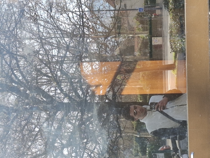 This image displays a scene viewed through a window, incorporating a reflection of an interior subject and a clear view of an exterior urban environment in Grenoble, France. In the foreground, an adult male is reflected in the window. He possesses short, dark, curly hair and is wearing a cream-colored sleeveless vest over a dark long-sleeved garment. He holds a black smartphone in his right hand, pointed toward the camera, indicating a self-portrait or screen interaction. To the left of the male's reflection, the handlebars and a portion of a dark-colored scooter or motorcycle are visible. The bottom of the image shows a horizontal brown window frame or sill. The exterior environment, visible through and around the reflection, features a street lined with numerous large deciduous trees displaying bare branches, suggesting a winter or early spring season. A prominent vertical orange-amber light reflection or glow is present on the window, obscuring part of a tree trunk in the center-right. Across the street, a paved road is visible, bordered by a concrete sidewalk, green grass, and low-growing bushes. Visible street infrastructure includes a utility pole supporting a blue square sign with a white bicycle icon, a cream-colored utility box with dark markings, and a red fire hydrant. A building with a reddish-brown tiled roofline is discernible in the mid-ground to the right. The scene is illuminated by natural daylight.