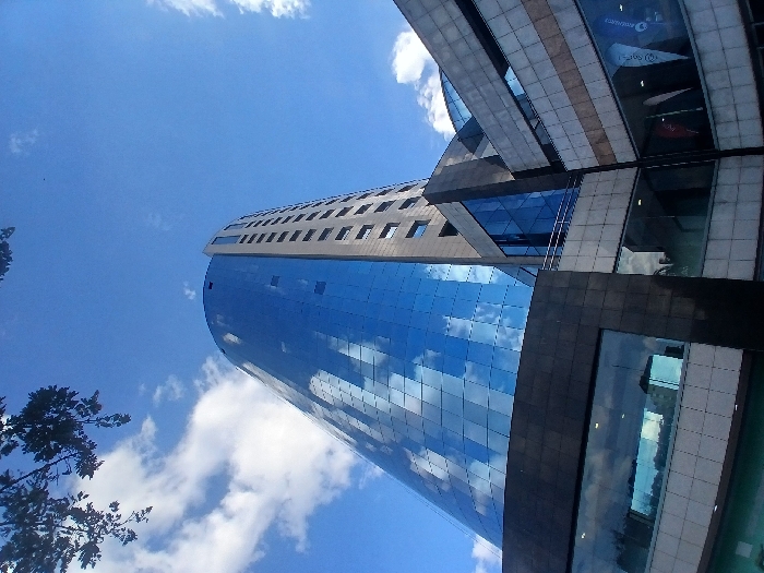 - "A low-angle view captures a modern building under a vibrant blue sky dotted with fluffy white clouds" by FM-YF5w12, licensed under CC BY 4.0