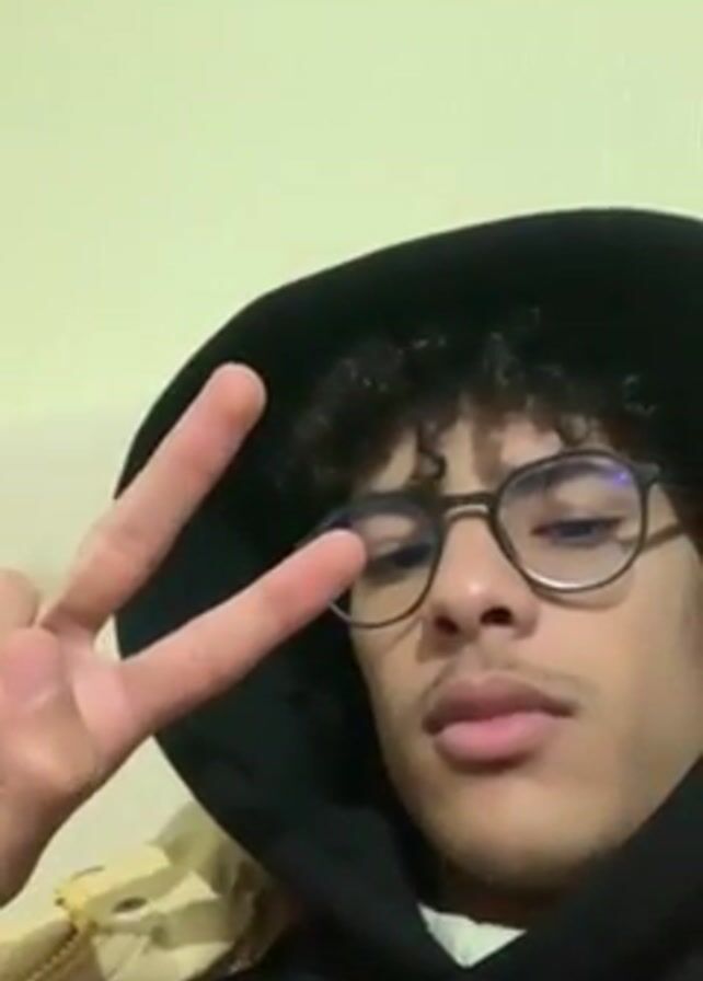 A young man with curly hair and glasses, wearing a black hoodie, makes a peace sign with his right hand