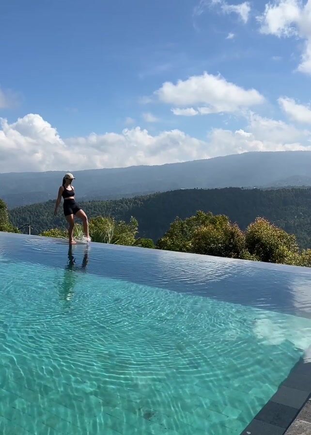 A young woman walks along the edge of an infinity pool against a beautiful mountain backdrop under a bright, blue sky. She is wearing a black swimsuit and a visor. She stops briefly to kick her leg out, sending water droplets into the air, and then lifts her arms in the air, enjoying the view. The pool is filled with clear, turquoise water that reflects the sky and surrounding mountains. The distant mountains are green, and the sky has scattered white clouds. The scene is serene and picturesque.