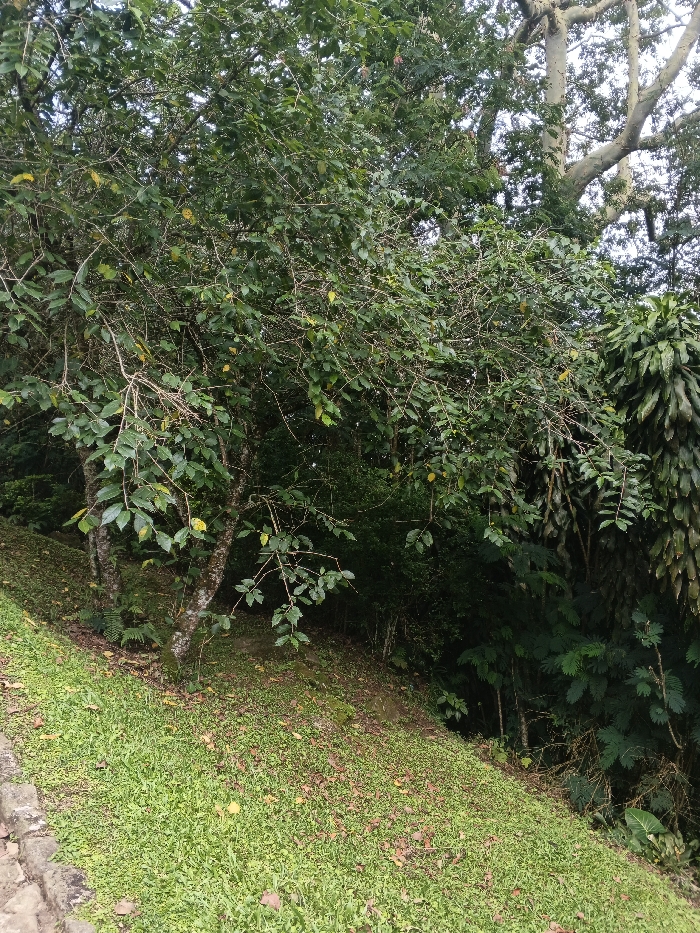 A lush green hillside is covered in short grass and fallen leaves. A small tree with slender branches and dense leaves stands at the top of the hill, its trunk branching into several stems. Behind it, dense foliage and taller trees create a dark, overgrown backdrop. To the right, a patch of vibrant green ferns and other plants cascade down the slope. The scene conveys a sense of wild, natural beauty.