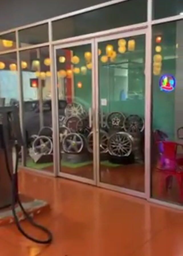 The camera pans slightly to the right in a room that appears to be decorated in a retro style. The floor is painted a bright orange, reminiscent of a vintage garage. To the left is an old-fashioned gas pump, adding to the retro aesthetic. The main focus is a section enclosed by glass doors, creating a display area. Inside, various car wheels are stacked on top of tires. The walls inside the glass enclosure are painted green. There are hanging lights, some spherical and others resembling lanterns, suspended from the ceiling, creating a warm glow. In the reflection of the glass, a man is visible standing near a red table and chairs. The lighting in the room is dim, contributing to the vintage vibe.
