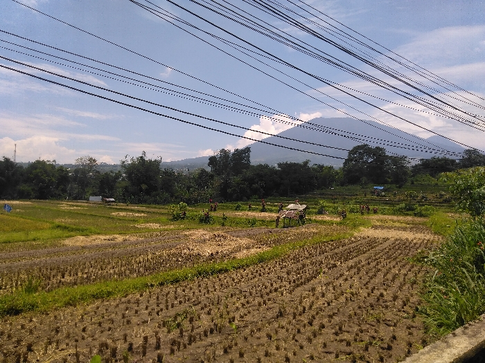 The image depicts an extensive agricultural landscape in Pyi Nuang, Myanmar, under a bright blue sky with scattered white clouds. Multiple black power lines traverse the upper portion of the frame diagonally from upper left to upper right. In the foreground, the terrain consists of harvested or prepared fields, predominantly light brown with short stubble and interspersed patches of greener vegetation. A concrete-like ledge is visible in the lower right corner. The midground features numerous human figures, identifiable by their small scale and dispersed arrangement, engaged in manual field work, some appearing to be bent over the ground. A prominent, open-sided shelter with a dark, sloped roof is centrally located in the midground, with individuals positioned near it. Further into the midground, additional smaller, simple structures, including one light-colored hut with a dark roof, are visible within the fields. Patches of taller green foliage are present, particularly on the right side. The background is defined by a dense horizontal band of green trees and foliage, beyond which a large, dark, conical mountain rises prominently, its upper slopes partially obscured by white clouds. Distant hills are also visible to the left of the main mountain. A tall, slender communication tower or similar structure is discernible above the treeline on the far left horizon.