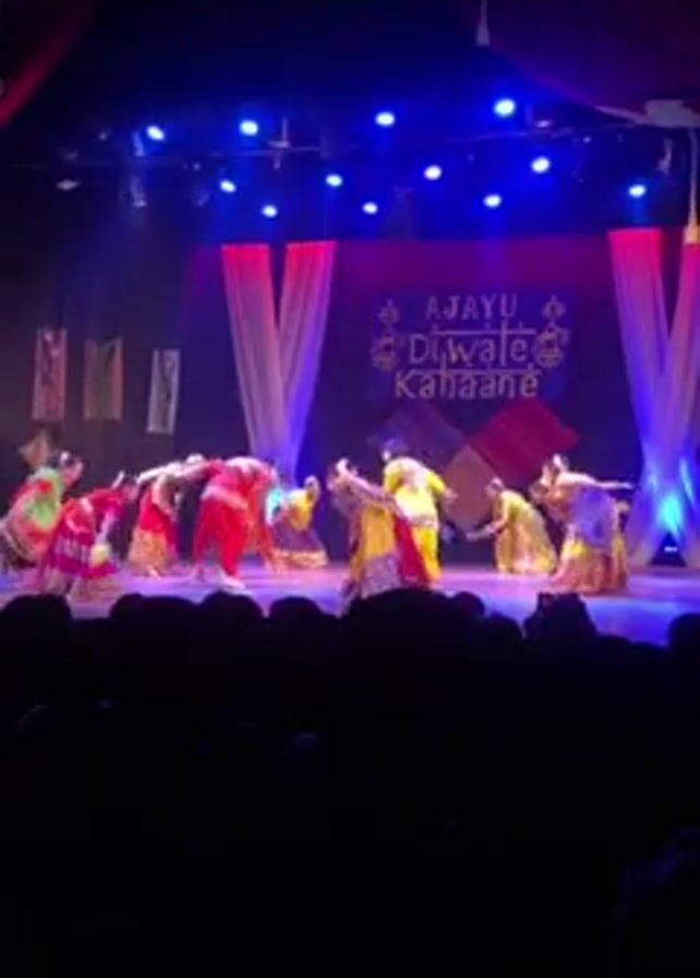 On a dimly lit stage, a group of nine dancers perform in front of an audience. They wear brightly colored traditional Indian clothing, mostly red, yellow, and blue. The backdrop reads "AJAYU, Diwale Kahaane" in large, stylized letters. Vertical, sheer curtains, illuminated with blue and purple light, frame the backdrop. The stage is bathed in a mix of blue and white spotlights. The dancers move in a coordinated fashion, their movements fluid and graceful. The audience sits in the dark, their silhouettes visible.