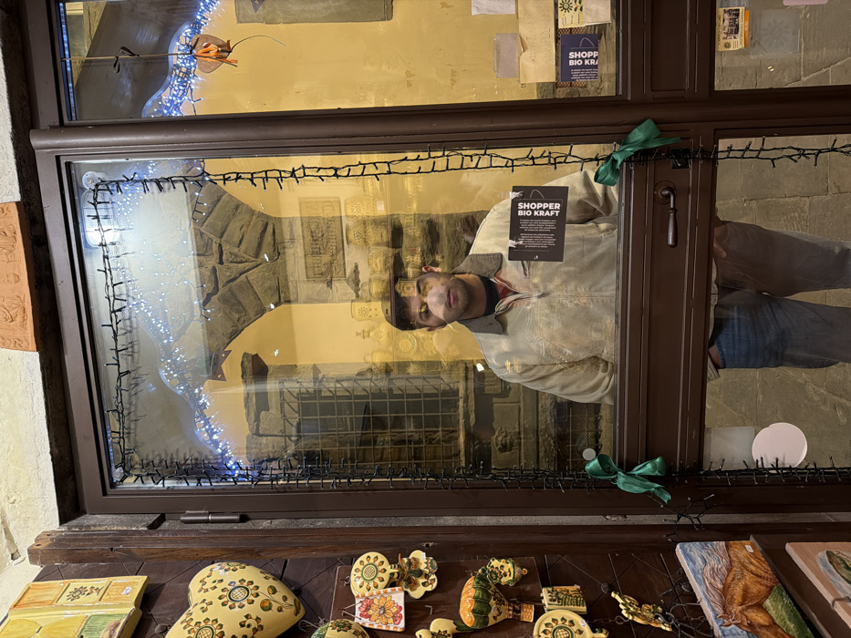 A person is reflected in a window display case. The display case is adorned with fairy lights, and a sign that reads "SHOPPER BIO KRAFT." The person is wearing a jacket and jeans. Underneath the window, various decorative objects are displayed, including ceramic items with floral designs. The reflection shows an interior with stone arches and walls.