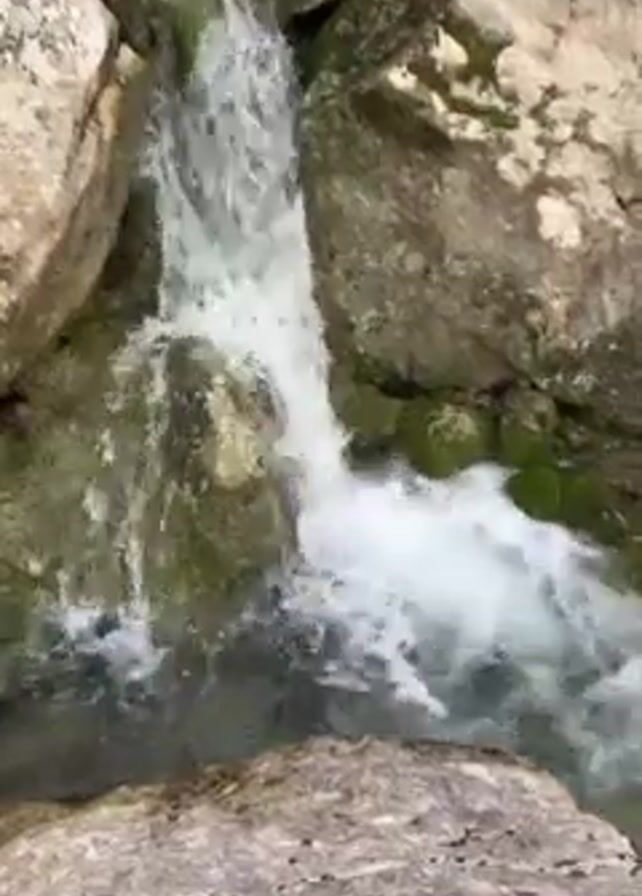 small waterfall cascading over mossy rocks into a pool of water. The rocks are light brown and tan, and some are covered in green moss. The water is clear and foamy as it rushes down the rocks. The sound of the waterfall is audible.