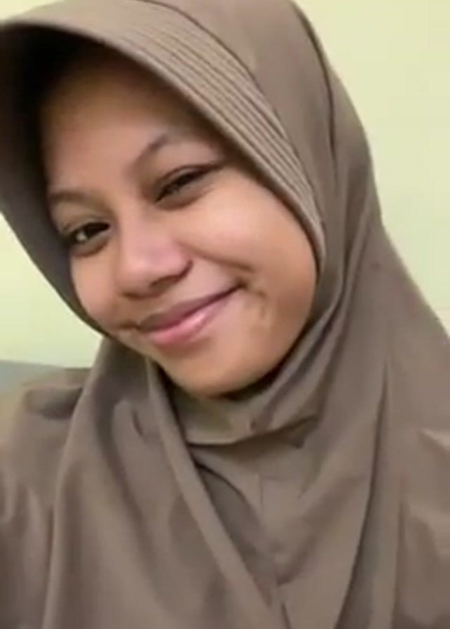 A woman wearing a brown hijab faces the camera, initially smiling