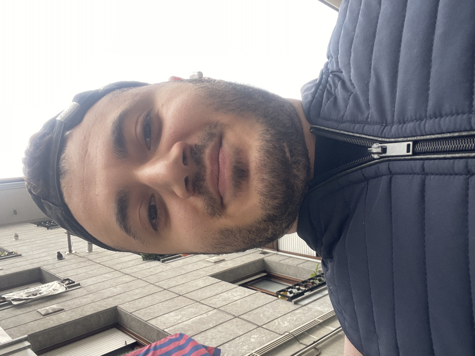 A male individual is depicted in a close-up selfie, positioned outdoors in the city of Eibar, Spain