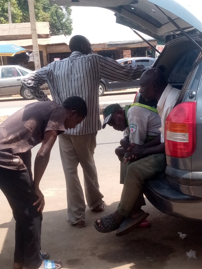 The image displays an outdoor street scene in Kafanchan B, Nigeria, featuring four adult males interacting around the rear of a dark grey SUV with its tailgate open