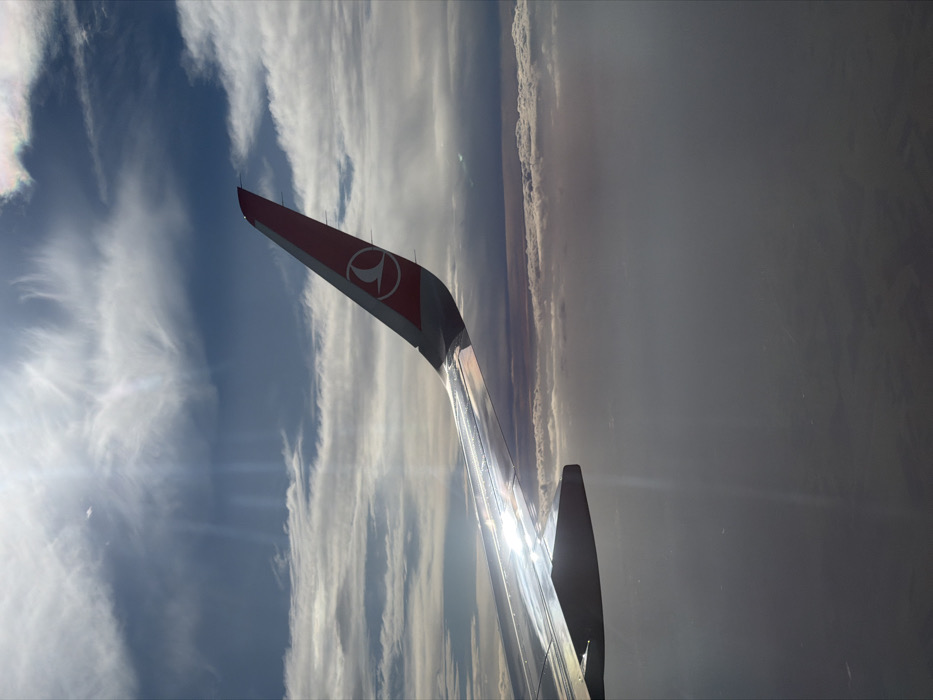 The image displays an aerial view from the window of an aircraft, likely a commercial airliner, in the vicinity of Arnavutköy, Turkey. The prominent subject is the polished metallic wing of the aircraft, extending from the lower left to the upper center-right. Strong sunlight reflects off the wing's surface, creating bright glares. The wingtip features an upward-curving winglet, predominantly red on its upper portion, displaying the white crescent moon and star logo of Turkish Airlines. Above the wing, the sky is partially cloudy, featuring a mixture of wispy cirrus clouds in the upper reaches and denser, whiter cumulus clouds below them. Sunlight filters through gaps in the clouds in the upper left, casting visible crepuscular rays. A subtle iridescent halo is visible within the clouds towards the upper right. Below the aircraft wing, the lower atmosphere is characterized by thick haze or a low cloud layer, significantly obscuring any ground features. The distant horizon is indistinguishable. No people are visible. The aircraft is in flight.