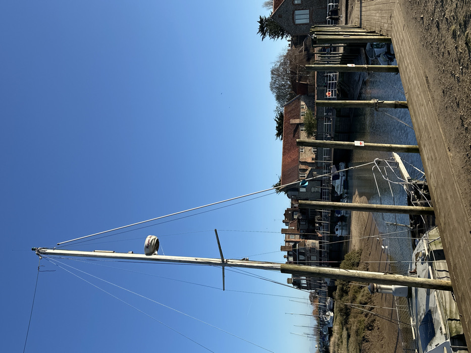 The image captures Blakeney Quay in North Norfolk, United Kingdom, on a clear, bright day under a cloudless blue sky. A tidal river channel, indicating low tide by exposed mudflats, dominates the midground. In the foreground, a weathered wooden boardwalk or quay extends from the lower right. To its left, a large sailboat is partially visible, its white mast with a prominent Raymarine radar dome and extensive rigging rising against the sky. The sailboat's hull appears to be settled near or on the mudflats. A series of vertical wooden mooring posts, some marked with small red-and-white signs, delineates the channel's edge. Across the water, a collection of historic brick and stone buildings with red tiled roofs lines the quay. These include a multi-story structure with a darker facade on the left and a distinctive red-roofed building on the right. Several smaller motorboats and sailing dinghies are moored in the channel or resting on the exposed mud. Scattered trees, both deciduous and evergreen, are visible among and behind the waterfront structures. No individuals are discernible within the frame.