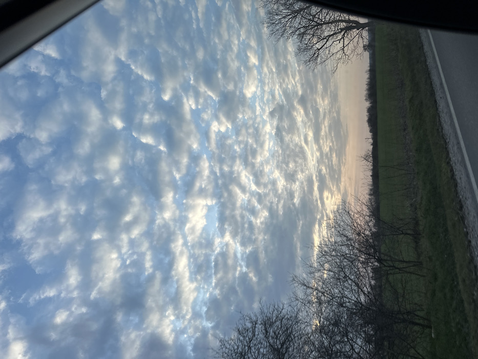 The image displays a rural landscape captured from within a vehicle in Topchii, Bulgaria. The upper two-thirds of the frame are dominated by a sky filled with an extensive formation of altocumulus clouds, exhibiting patterns of light grey, white, and patches of light blue sky visible between the cloud masses. The lower horizon presents a faint yellowish-pink glow, suggesting dawn or dusk. The middle ground consists of a flat expanse of green fields. The left foreground features a cluster of leafless deciduous trees with intricate bare branches extending upwards. A larger, bare deciduous tree is partially visible on the far right. The bottom edge of the image shows a segment of a paved road, marked by a white line on its shoulder. No individuals, animals, or specific activities are present in the scene. A dark frame, likely from a vehicle window, is visible along the right edge of the image.
