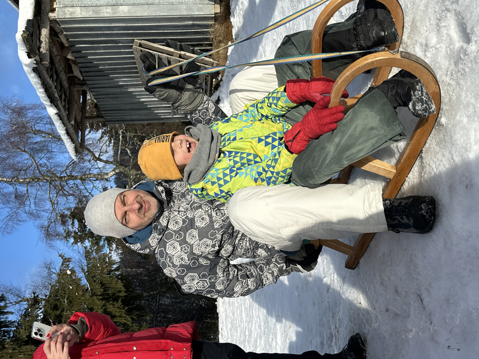 - "In Stoikite, Bulgaria, on a clear, sunny winter day, an adult male and a child are seated together on a wooden sled in a snowy outdoor environment" by FM-o3SHn1, licensed under CC BY 4.0