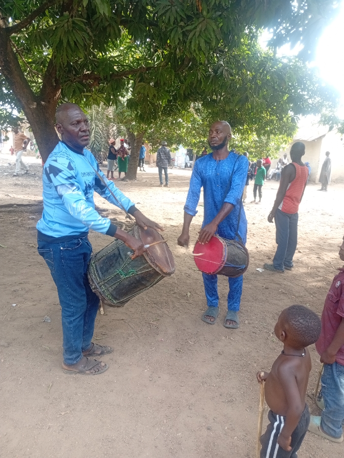 two men playing drums in the town of Gundzhe, Nigeria, located at latitude 8