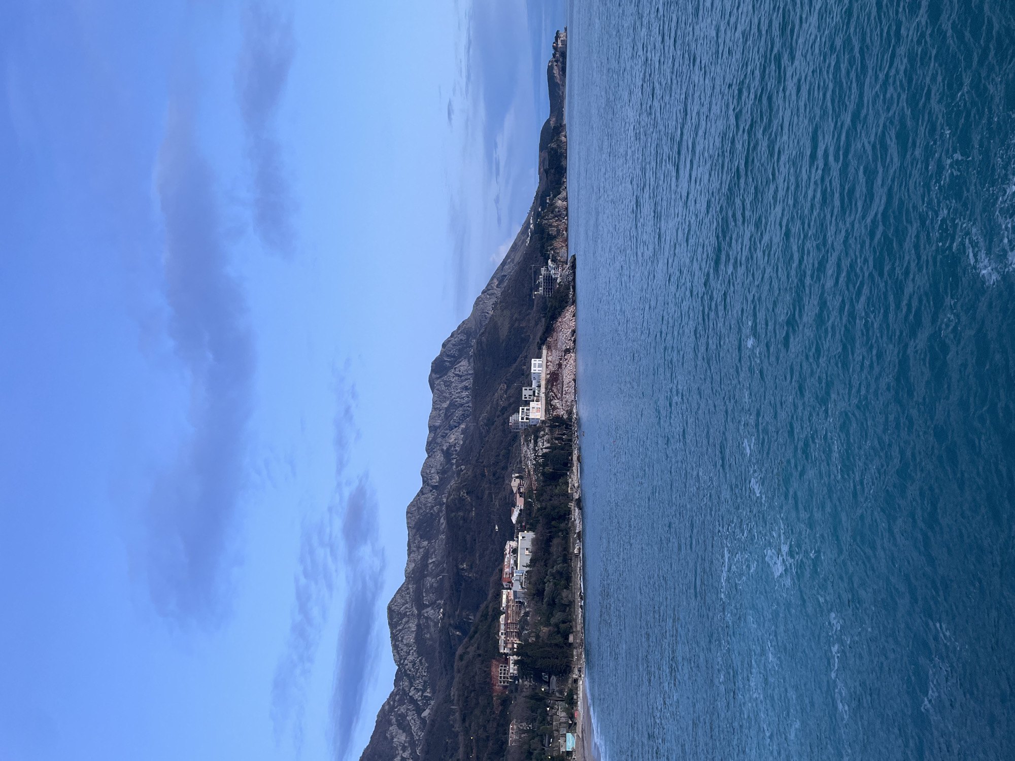 A panoramic view of the Kamenovo coastline in Montenegro is presented under a pale blue sky with scattered, elongated grey clouds