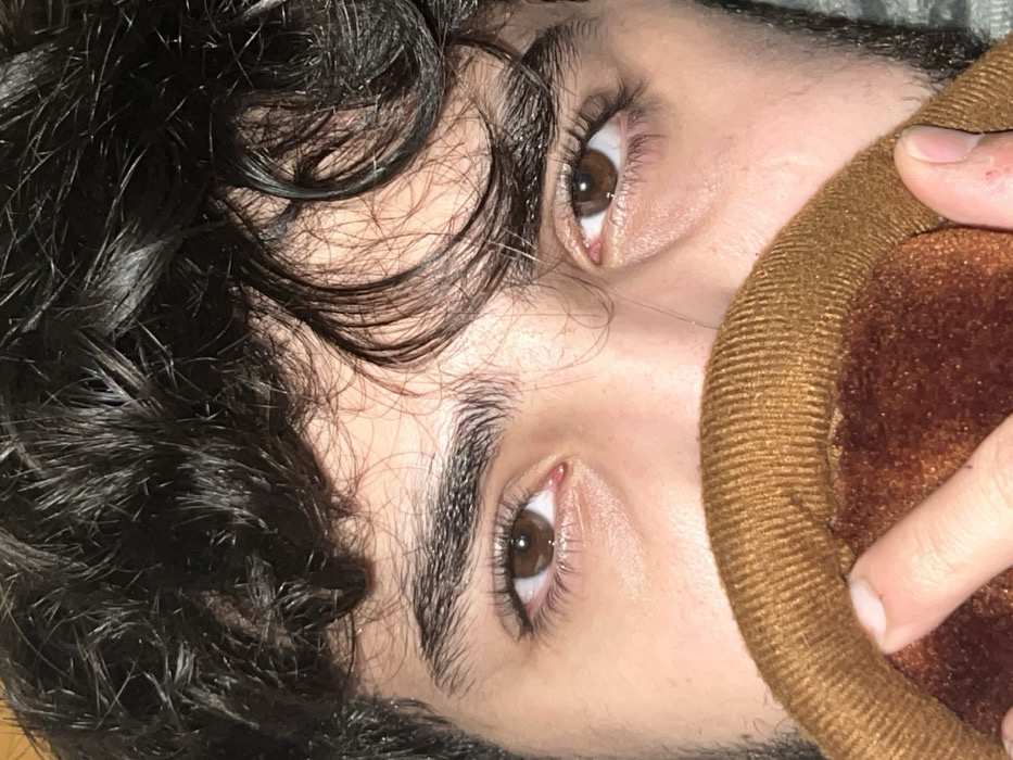 A close-up portrait shows a person with dark, curly hair partially covering their forehead. Their brown eyes gaze directly at the camera. The skin is fair and smooth, and neatly shaped eyebrows accentuate their face. A brown, textured fabric is held near the face, partially obscuring one side. The individual's expression is soft, conveying a sense of calm or introspection.