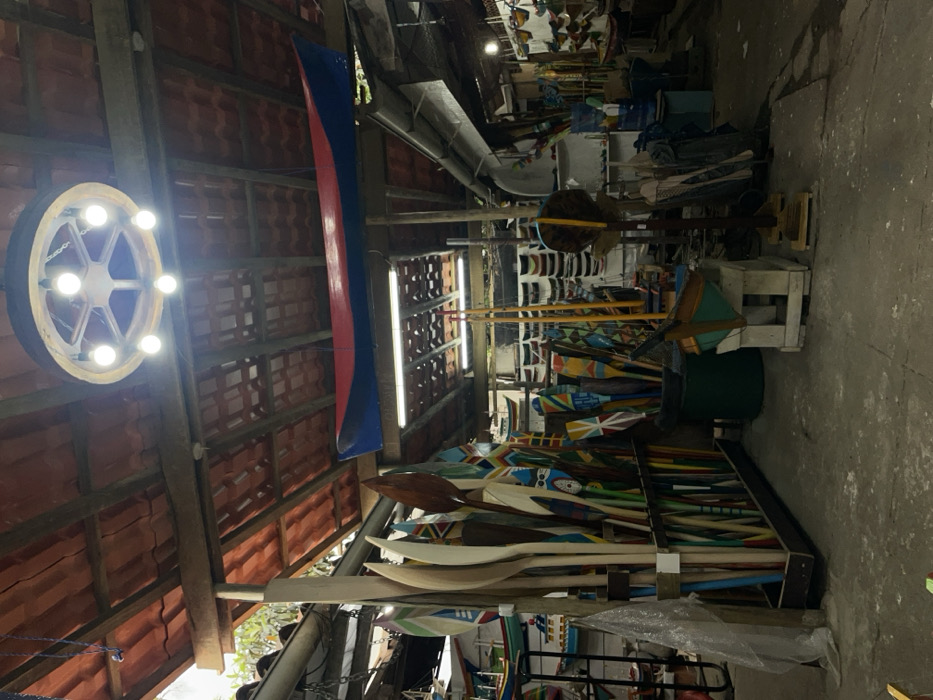 A cluttered workshop showcases a variety of paddles and oars stored in shelves and against walls. A large green cylindrical container and wooden crates hold more paddles. A section of a boat hangs from the ceiling near a circular light fixture. The shop's interior features a textured tile roof. The overall scene is brightly lit from an unknown source.