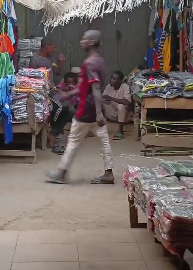 group of men and boys inside a covered market area. Four people are seated on the ground near a closed metal door. One of them appears to be looking at a mobile phone. Another man stands near a stack of colorful clothing items on a wooden table, talking and gesturing with his hand. A young man in a red and black shirt walks past the group. The market area has makeshift roofing with hanging white material and is filled with stalls displaying clothing items in plastic wrap. The floor is tiled.