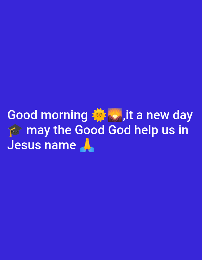 This digital image presents white text centered on a solid royal blue background. The text states: "Good morning ✨🌄,it a new day 🎓 may the Good God help us in Jesus name 🙏". Embedded within the text are four emojis: a yellow sparkle, a sunrise over mountains, a black graduation cap, and praying hands. The scene depicts no physical environment, people, subjects, objects, actions, or interactions. The location is the city of Unknown, Unknown.