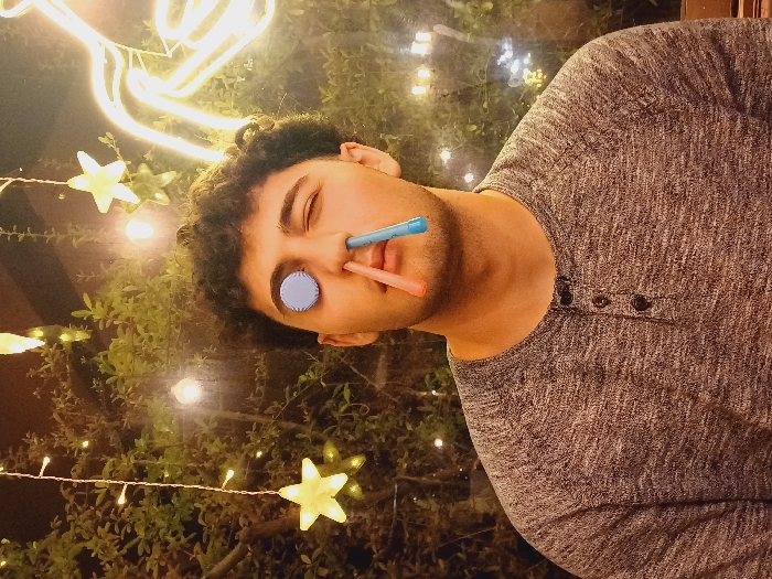 A person poses with objects on their face in front of illuminated greenery and lights. A blue bottle cap covers one eye. Blue and pink straws protrude from the nostrils. The individual is wearing a heather gray, long-sleeved shirt with three buttons on the upper chest. The background includes star-shaped string lights, a neon reindeer decoration, and leafy plants.