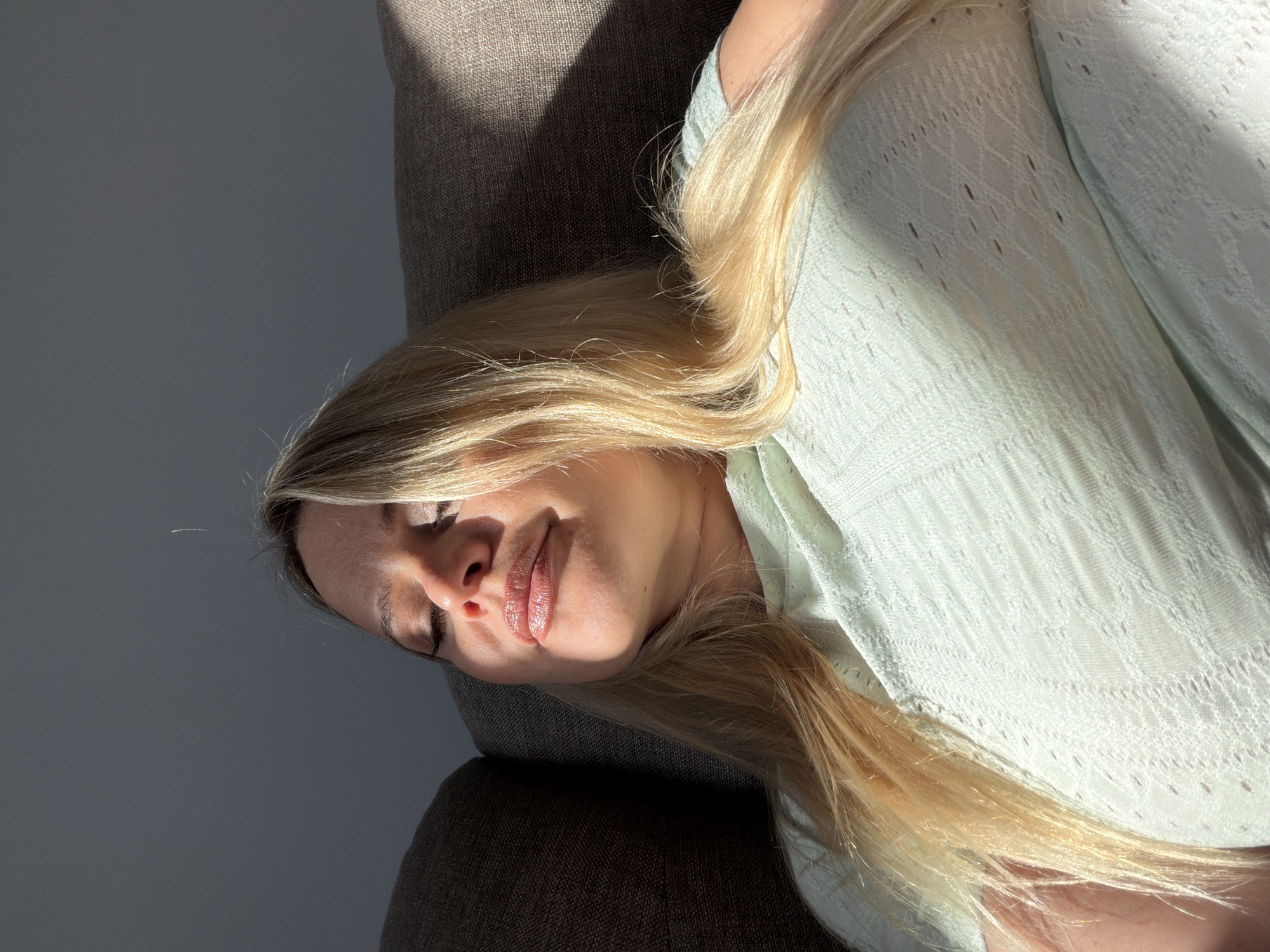 A single adult female is depicted indoors, reclining on a brown upholstered sofa or chair. She has long, blonde hair draped over her shoulders and chest. Her eyes are closed, and her head is tilted slightly upward, exposing her face to a strong, direct beam of sunlight from the right. Her lips are slightly parted and appear moisturized. She is wearing a light green, short-sleeved top with a subtle patterned knit. The background consists of a plain, dark gray wall. The specific location in the city of Sarapul, Russia, cannot be determined from the visual information provided within the image.