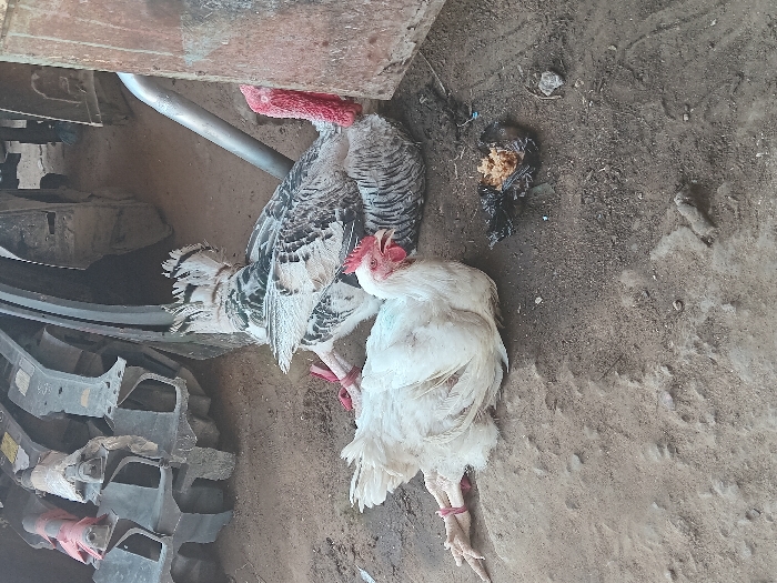 The scene is located in Sabon Gari East, Nigeria. The image depicts two birds, a white domestic chicken and a black and white speckled domestic turkey, lying on dry, uneven dirt ground. The white chicken is positioned in the foreground, lying on its left side. Its legs are bound with a red band. Immediately behind the chicken, the turkey is situated, lying on its right side; its legs also appear bound. A small black plastic bag containing discarded food, possibly grains or rice, rests on the dirt ground to the right of the chicken. In the background, various pieces of dark, metallic debris are visible, including what appears to be part of a heavy machinery track or large tire. A silver-colored metal pole extends diagonally across the mid-ground. The ground is dry earth with scattered small debris. No human subjects are visible.