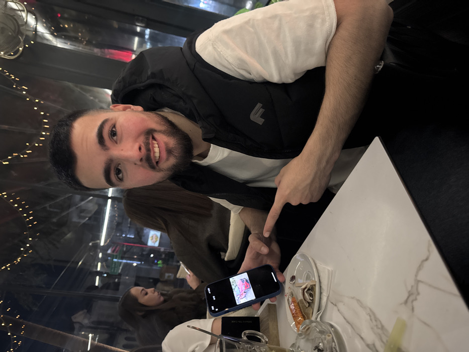 The image depicts an indoor scene within an urban cafe or restaurant in Stara Zagora, Bulgaria, during nighttime. A young adult male, of apparent Middle Eastern or Mediterranean descent, with short dark hair and a beard, occupies the foreground. He is smiling directly at the camera, wearing a white short-sleeved t-shirt beneath a black hooded puffer vest featuring a grey "F" logo on the left chest. He is seated at a white marble-patterned table. In his left hand, he holds a blue-cased smartphone displaying an image of a red sports car. His right index finger is extended, pointing at the phone screen. On the table in front of him, a white ceramic plate holds a partially consumed pastry item, possibly a wrap, alongside a brown wrapper. To the immediate left, a clear glass ashtray containing cigarette ash and butts is visible, next to a tall glass mug with a handle and a transparent straw. In the blurred background, through large glass panels, city lights and reflections suggest an outdoor urban environment. Decorative string lights are suspended overhead within the establishment. Two additional individuals are seated at tables behind the main subject. One female with long dark hair is partially visible to the left, looking down at a smartphone. Another person is further back and less distinct. The specific street address or name of the establishment within Stara Zagora, Bulgaria, is not discernible from the visual information provided.
