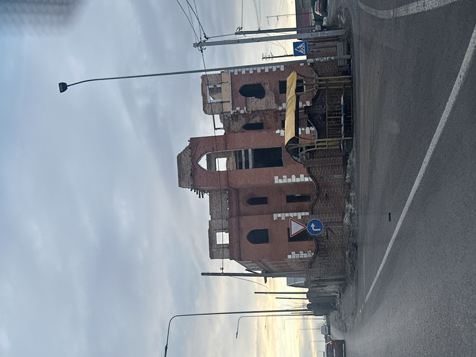 - "The image depicts a street scene in Hostomel, Ukraine, dominated by a significantly damaged multi-story building constructed of red brick with white accents" by FM-vN6QQ2, licensed under CC BY 4.0