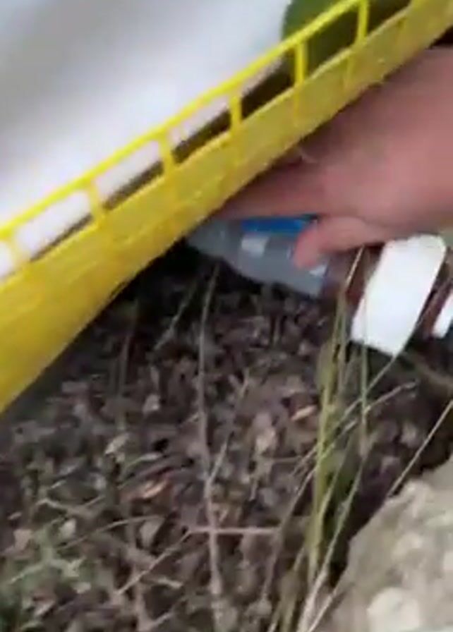 A close-up video shows a person's hand reaching under a white structure with a yellow border. The hand grabs a small, blue-and-white water bottle with a white cap and nozzle, removing it from underneath the structure. The ground beneath the structure consists of dirt, grass, leaves, and rocks. The structure appears to be elevated, allowing space underneath for the water bottle and other debris.