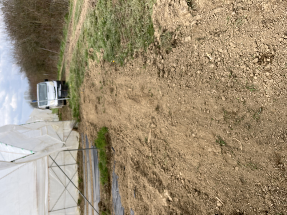 The scene depicts an agricultural area in Krško, Slovenia, under an overcast sky. In the foreground, a path of disturbed, light brown soil with scattered debris and sparse vegetation extends toward the middle ground. To the left, a series of white polyethylene tunnel greenhouses, supported by metal frames, are partially visible, with internal dark ground coverings or planting rows. A silver-colored commercial van is parked on a dirt track in the middle ground, facing away from the camera, positioned adjacent to the greenhouses. A blue pole or stake stands near the van's front. To the right of the dirt track, an area of green grass contains scattered yellow flowers. The background features a dense line of leafless deciduous trees and shrubs. No individuals, direct actions, or interactions are visible.