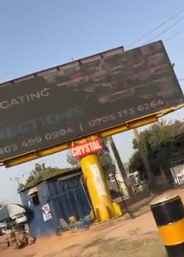 The camera is in a moving vehicle driving by a billboard advertising a business called "Crystal Solutions" with phone numbers 0803 499 0904 and 0705 133 6264