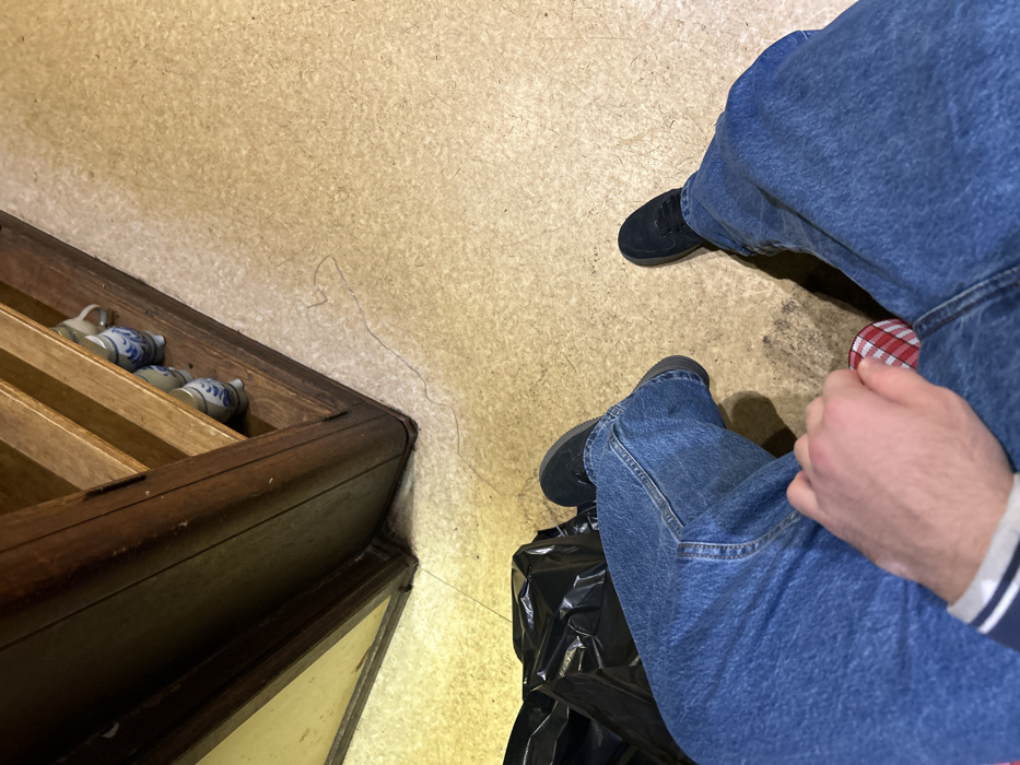 The image depicts a first-person, downward-facing view of an individual seated in an indoor environment. The individual is wearing blue denim jeans and black sneakers. A red and white plaid pattern is visible on an inner garment under the left hand, which rests on the lap, and a blue and white striped sleeve is visible on the left wrist. To the upper right, a dark wooden corner display cabinet with multiple shelves holds at least two small ceramic pitchers adorned with blue and white patterns. A black plastic bag rests on the floor to the left of the individual's left foot. The floor is covered with light beige linoleum or vinyl, showing some wear and light debris. A light yellow wall or partition is partially visible in the top left corner, behind the cabinet. This scene is located within the city of Strasbourg, France.