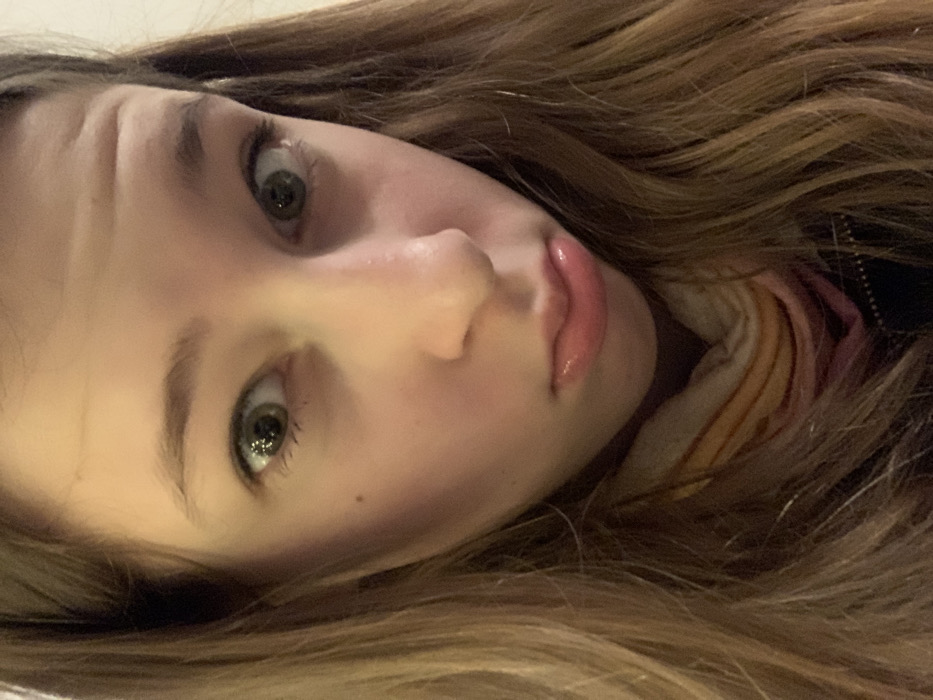 A close-up selfie features a young person with fair skin, light brown hair, and green eyes