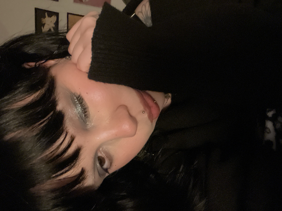 A woman with black hair and bangs poses close to the camera. She wears a black sweater, and her hand is near her face. She is fair-skinned and has a lip piercing. Her eye makeup is silver and shimmery. Her eye is open, and the rest of her face is illuminated. The background is dark, with a few framed pictures visible. The image is angled and has low lighting.