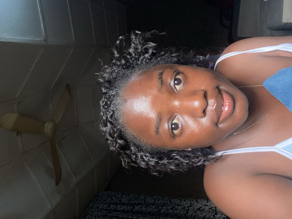 A young woman is lying down taking a selfie. She has dark skin, dark curly hair, and is wearing a blue top with thin straps. A thin gold chain is around her neck. She is looking directly at the camera with a slight smile. In the background, there is a wall with an old-fashioned ceiling fan. The lighting is dim, casting shadows in the room. The angle is slightly tilted.