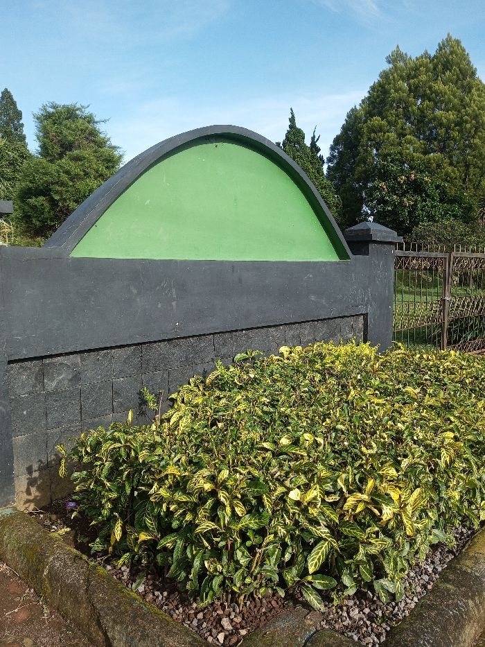 This outdoor scene, located in Salai Har Htan, Myanmar, depicts a section of a landscaped area under bright sunlight. In the foreground, a planter bed is filled with dense, variegated green and yellow-leafed shrubs, rooted in dark pebbles and bordered by a concrete curb. Behind this, a multi-tiered dark gray wall is present. The lower tier is composed of rectangular dark gray blocks, while the upper tier is smooth dark gray, surmounted by a prominent, light green, semi-circular arched segment. To the right, the wall transitions into a dark gray pillar and an adjacent dark metal fence with a decorative pattern. The background consists of numerous mature green trees, including tall conifers, beneath a clear blue sky with minimal cloud cover. No human figures or discernible activity are observed.