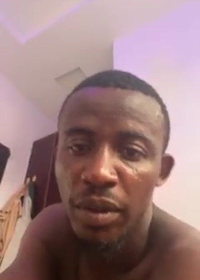 A shirtless man with short dark hair and a goatee is looking down at the camera with a sad expression. There are small teardrops on his face. He turns his head to the right, showing his ear and the back of his head. The background is a plain white ceiling with a white square light fixture. There is also a dark piece of furniture and a garment hanging on the back of a door in the background.
