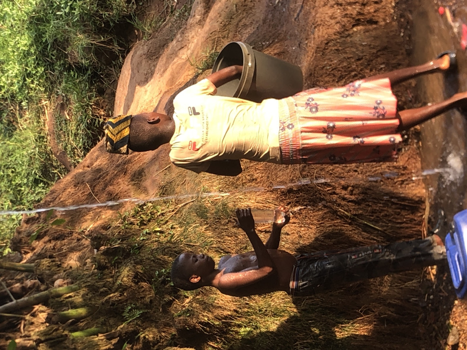 Two individuals, likely children or young adolescents, are engaged in water collection at a natural outdoor water source in Unknown, Unknown
