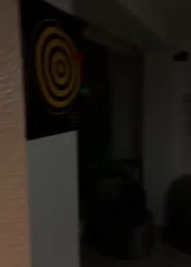dartboard on a wall in a dimly lit room. The dartboard is black with yellow concentric circles. There are two green darts and one red dart stuck in the board. The wall is white and has a textured surface. The room also contains a couch and other furniture that are out of focus.